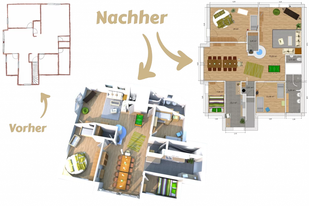 Dann ist ein professioneller dreidimensionaler Grundriss das Ideale. Ihre Interessenten nehmen dies als attraktiver, professioneller und übersichtlicher war.